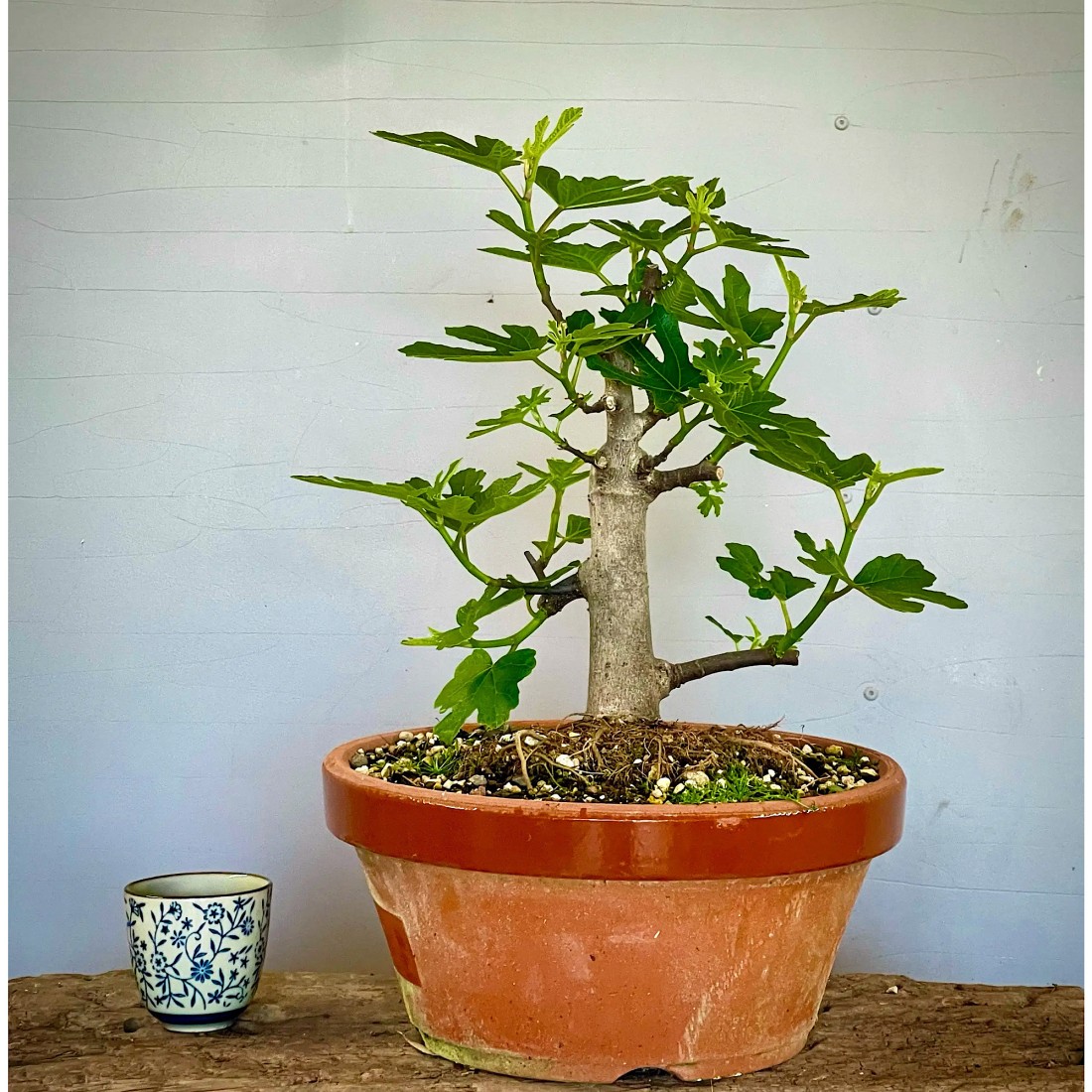 Bonsai Higuera, Ficus carica. Bonsái de exterior, típicamente mediterráneo. Es un bonsái que se caracteriza por producir frutos comestibles, los higos. Destaca también por su rápido crecimiento. Necesita el sol y el frío para producir sus frutos.