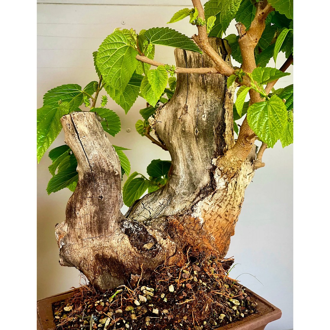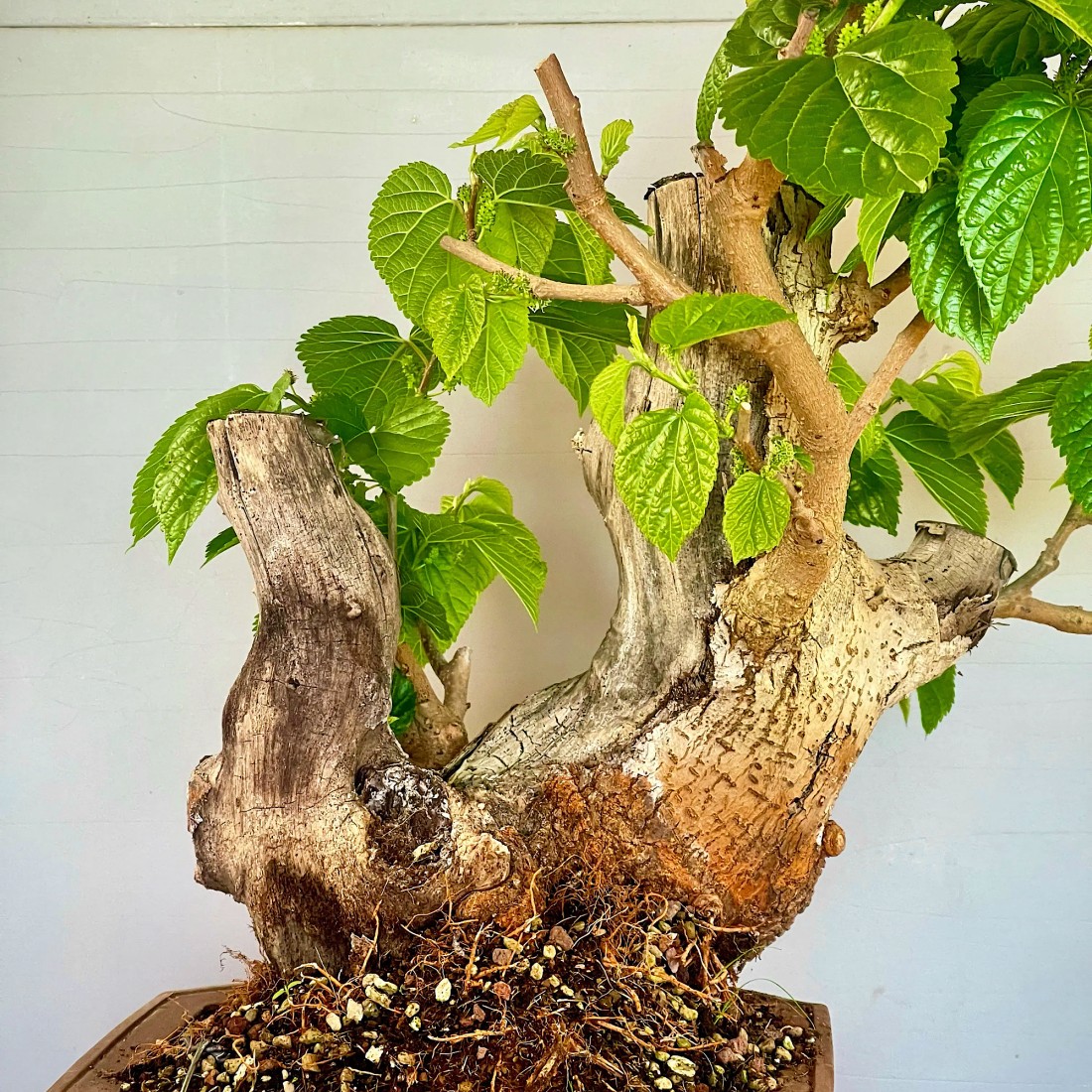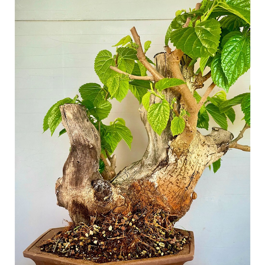 Bonsai Morera, Morus. Bonsái de exterior, típicamente mediterráneo. Es muy apreciado por sus frutos comestibles, las moras. Necesita el sol y el frío para producir sus frutos.