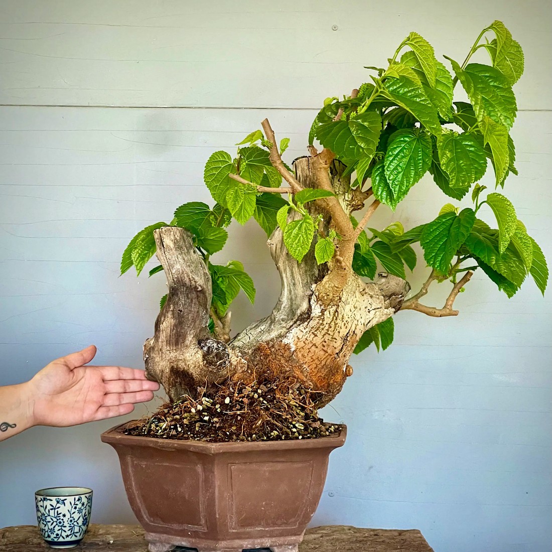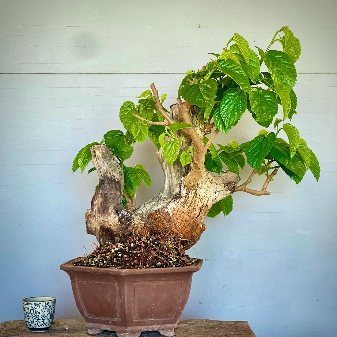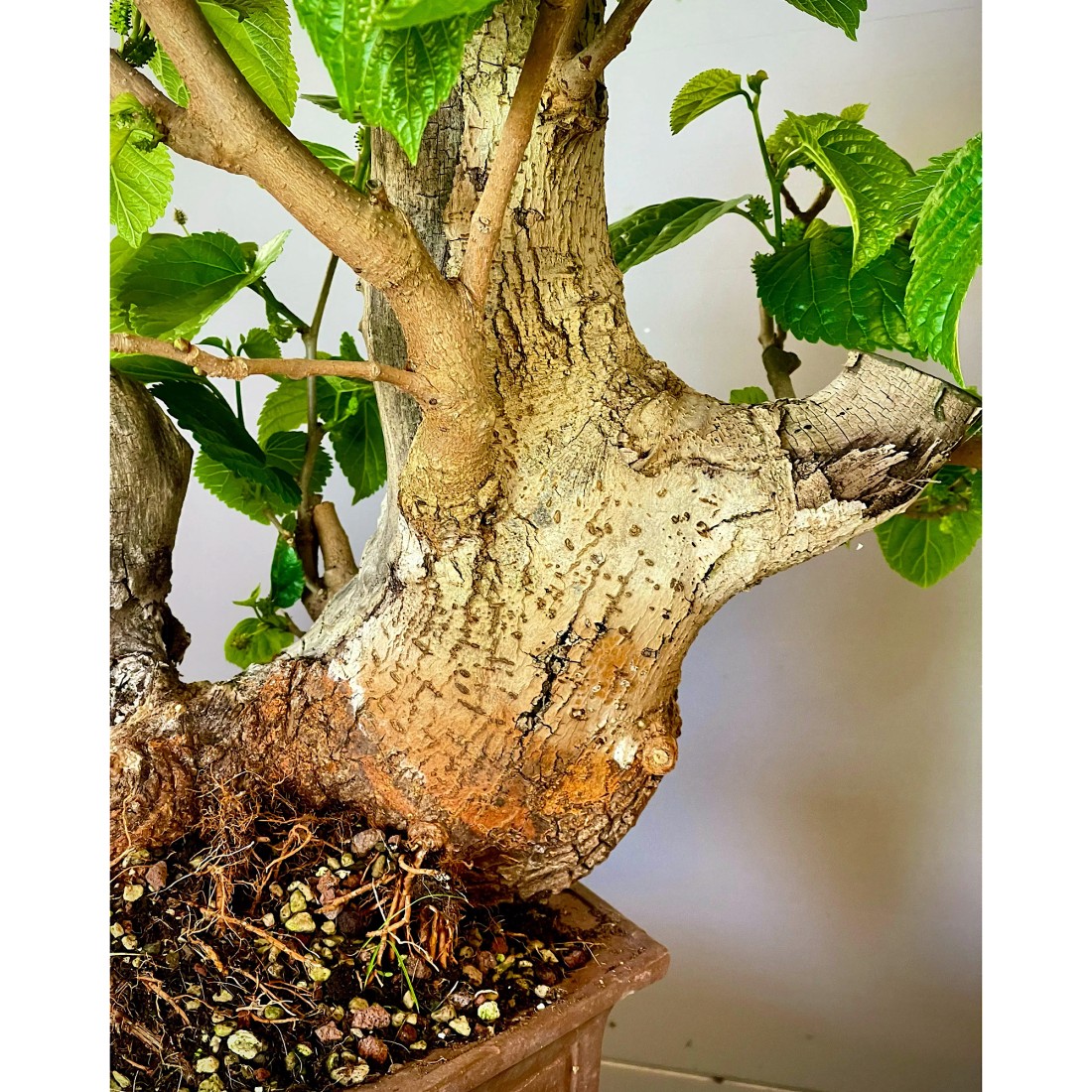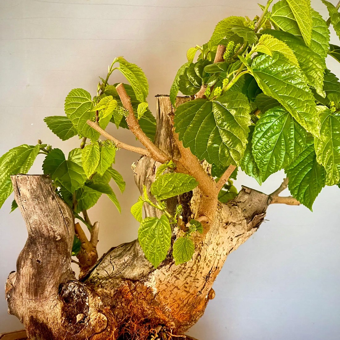 Bonsai Morera, Morus. Bonsái de exterior, típicamente mediterráneo. Es muy apreciado por sus frutos comestibles, las moras. Necesita el sol y el frío para producir sus frutos.