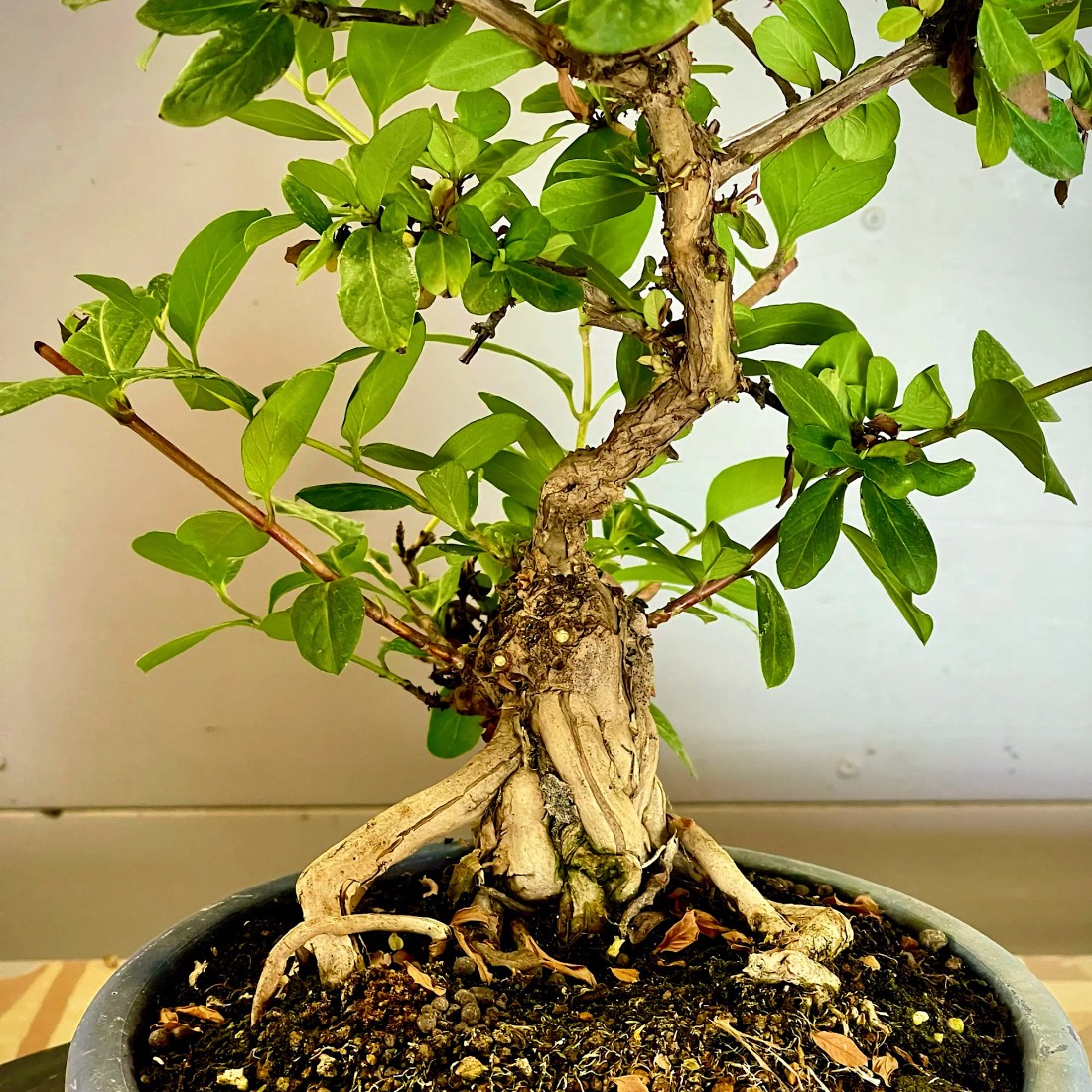 Tronco con Carácter: Posee un nebari (base) muy establecido y raíces expuestas que le otorgan una apariencia de árbol anciano.