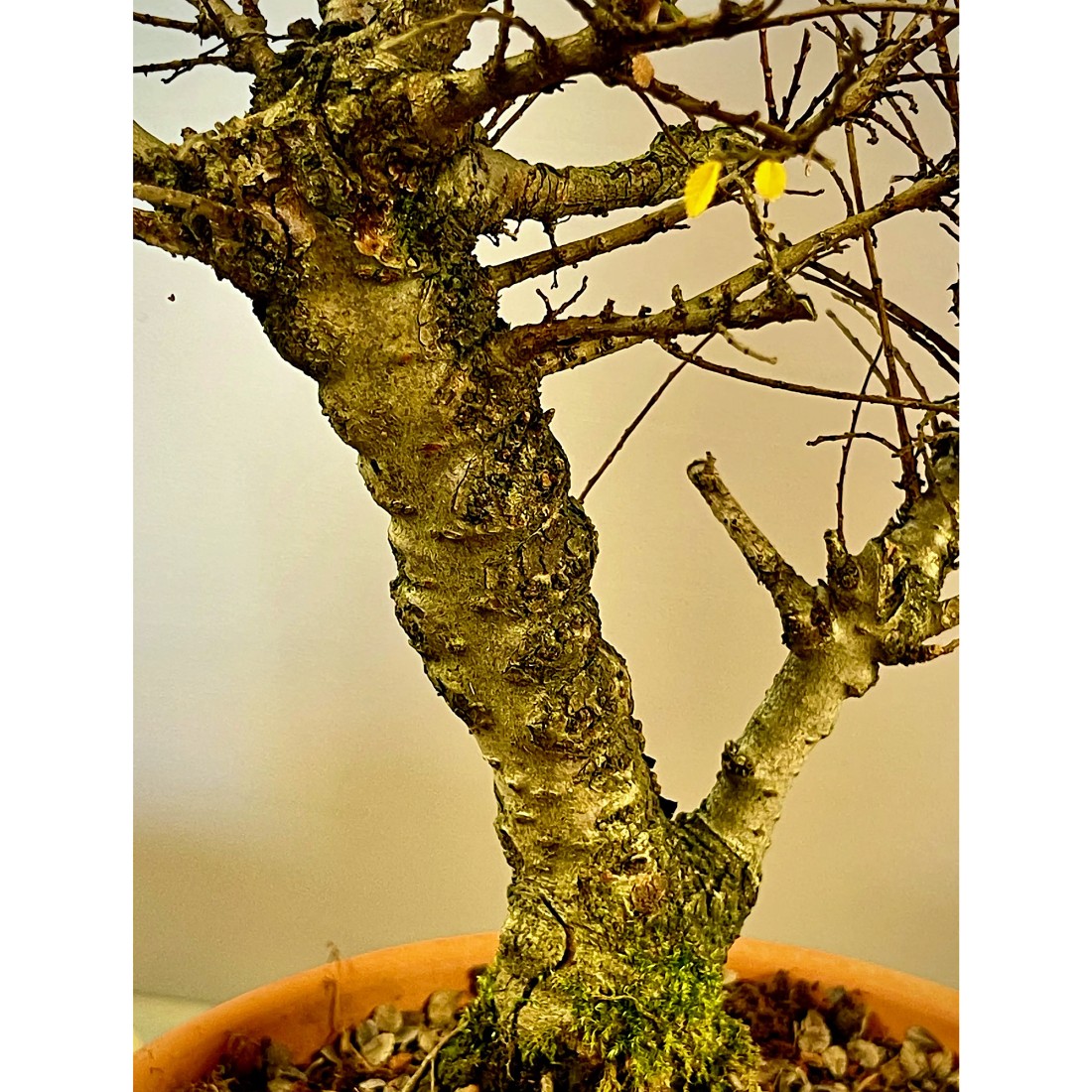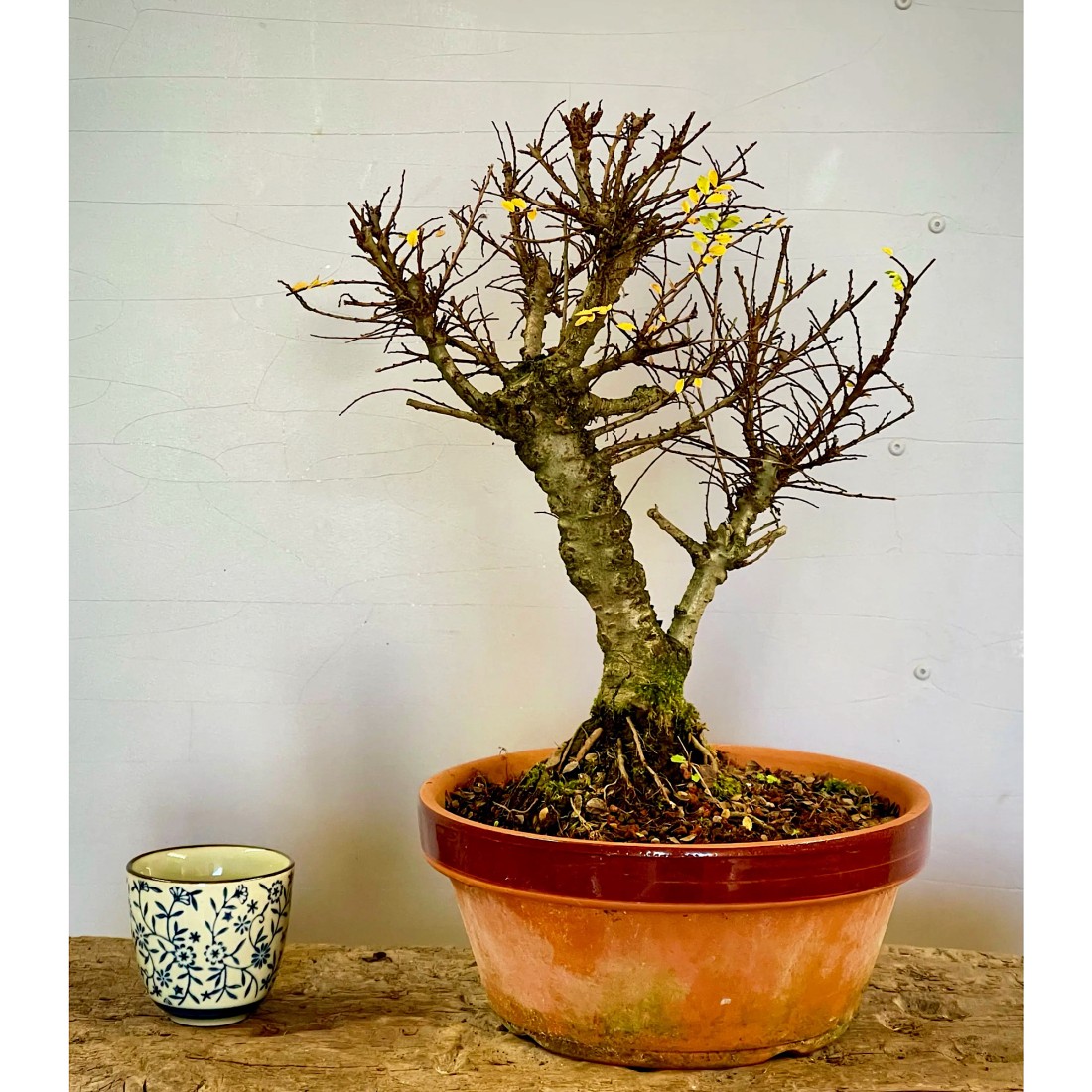 Estilo sugerido: El estilo más clásico para la Zelkova es el Hokidachi (Escoba), ya que imita su forma natural de crecimiento en la naturaleza, aunque la variedad 'Hokkaido' también luce espectacular en estilos informales debido a su tronco rugoso.