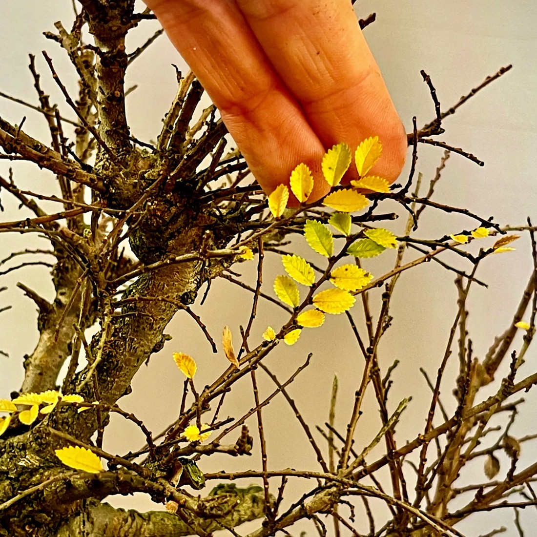 Hojas Diminutas: Sus hojas son de las más pequeñas en el mundo del bonsái, con una forma ovada y bordes dentados que mantienen una proporción perfecta incluso en tamaños "Mame" o "Shohin".