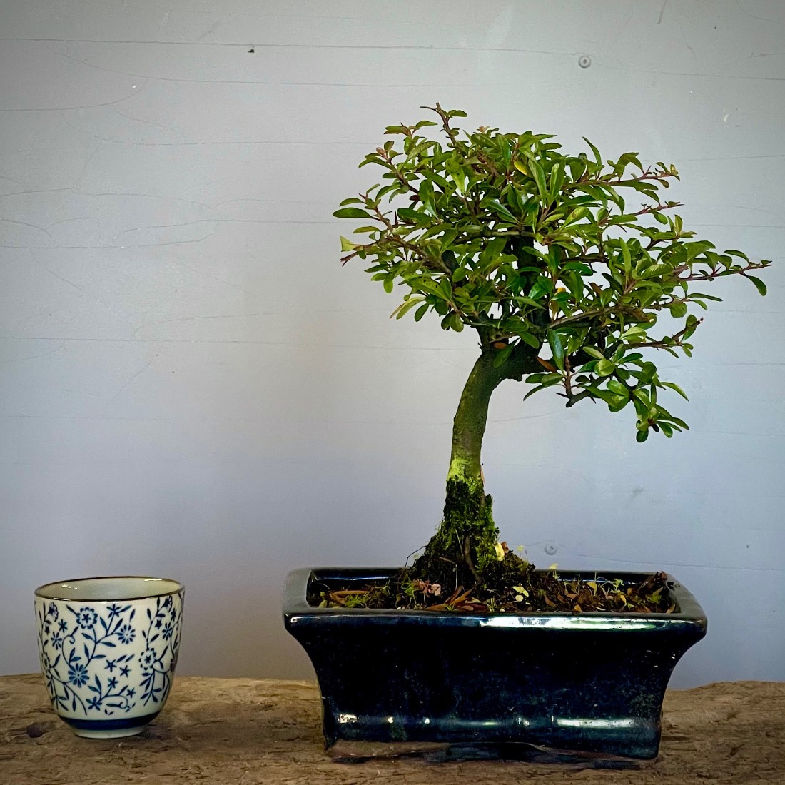Bonsai Pyracantha angustifolia, espino de fuego en maceta ceramica Yinxing.