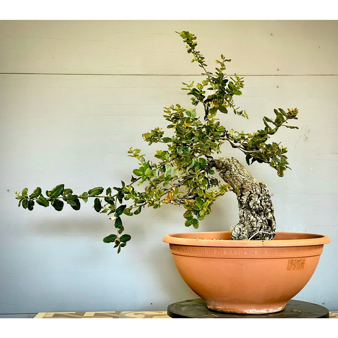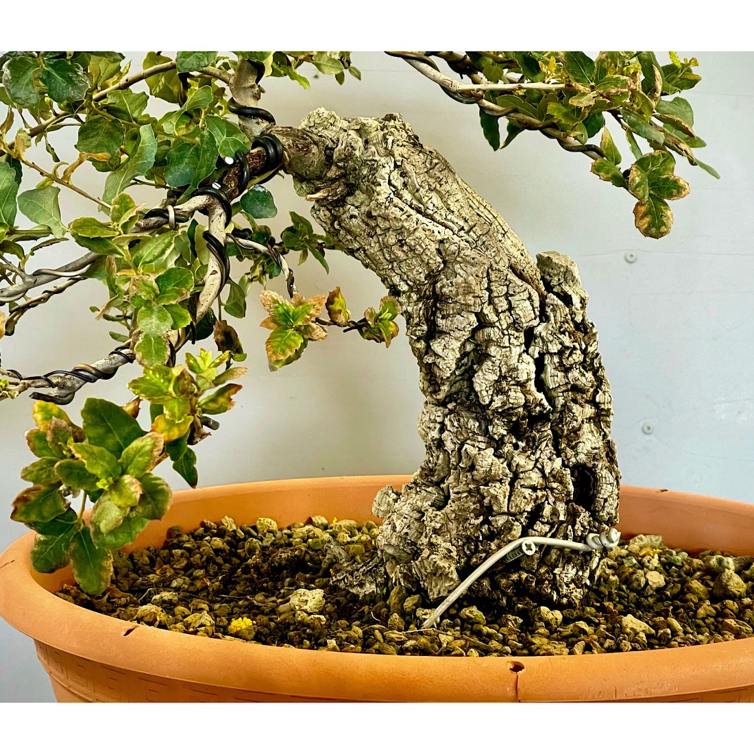 Bonsai Alcornoque, Quercus suber. Alcornoque mediterráneo o roble. Bonsái de exterior, típicamente mediterráneo. El alcornoque bonsái es apreciado por la singularidad que le ofrece la corteza de su tronco. Es un árbol muy resistente cuya ramificación lo hace ideal para formar bonsáis.